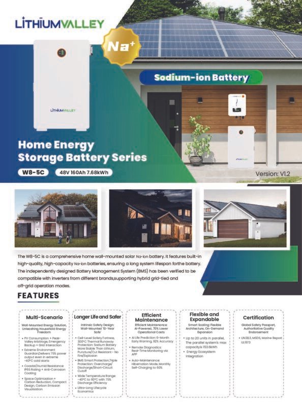 The W8-5C is a next-generation wall-mounted home energy storage battery powered by advanced sodium-ion (Na-ion) technology. With 7.68kWh of usable energy and a long cycle life of over 8000 cycles, this system provides a safe, cost-effective, and maintenance-friendly solution for modern solar-powered homes.