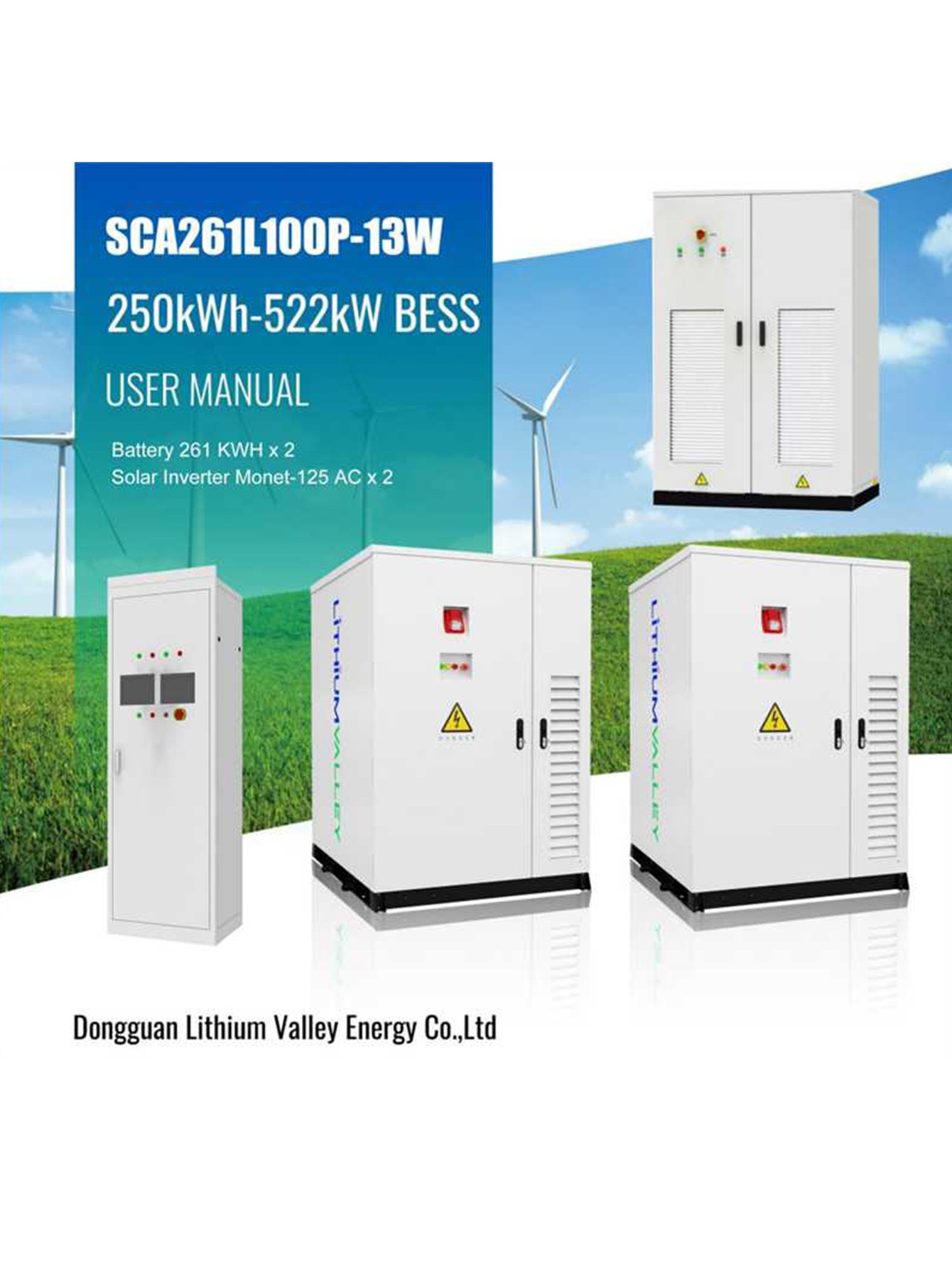 The LiTHIUMVALLEY SCA261L100P-13W is a commercial-grade energy storage system (BESS) with a total capacity of 250 kWh. It is paired with two Monet-125 AC photovoltaic inverters. It utilizes lithium iron phosphate (LiFePO4) batteries with a cell size of 3.2V and 314Ah. Each battery pack has a capacity of 52.24 kWh. A 1P260S battery pack configuration provides a cycle life of 28,000 cycles (at 25°C, 0.5/0.5P). With a nominal voltage of 832V, an operating voltage of 728-949V, and a rated charge and discharge power of 0.5P, it is suitable for industrial and commercial energy management scenarios.